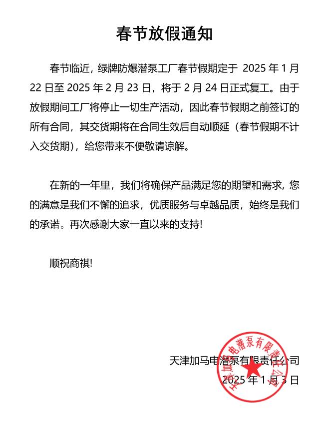 春節(jié)臨近,綠牌防爆潛泵工廠春節(jié)假期定于 2025年1月22日至2025年2月23日,將于2月24日正式復工。由于放假期間工廠將停止一切生產(chǎn)活動,因此春節(jié)假期之前簽訂的所有合同,其交貨期將在合同生效后自動順延(春節(jié)假期不計入交貨期),給您帶來不便敬請諒解。