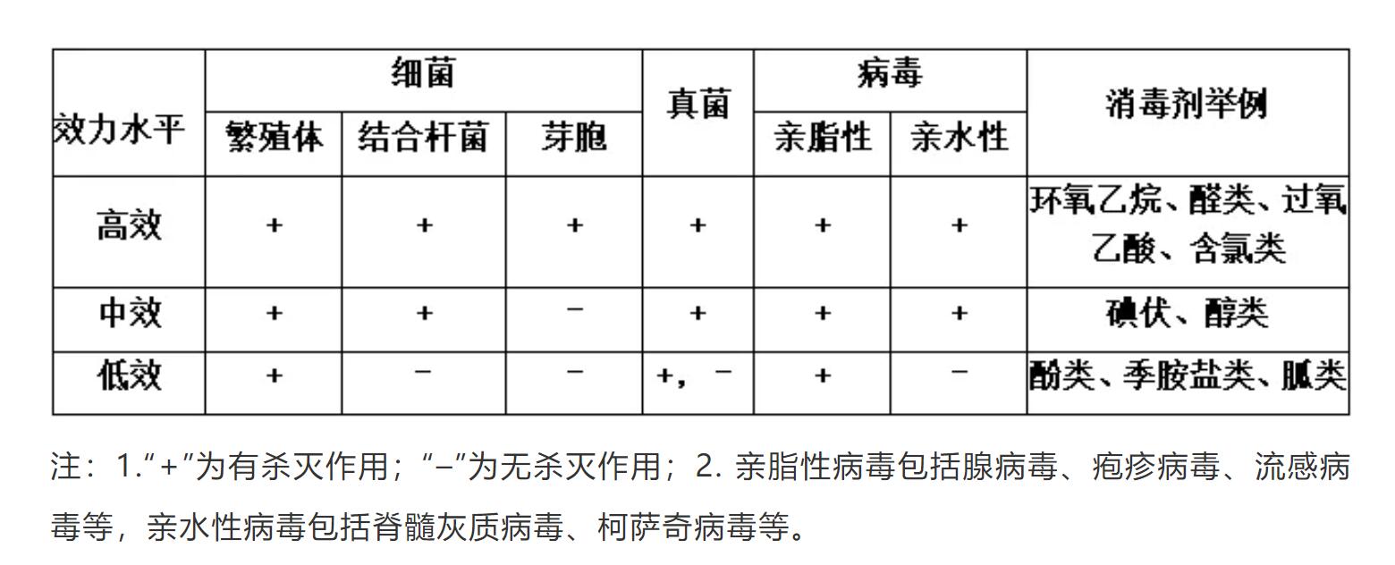 根據(jù)其對微生物的殺滅作用可分為高效、中效、低效三類。各類化學(xué)消毒劑的效力水平見下表。