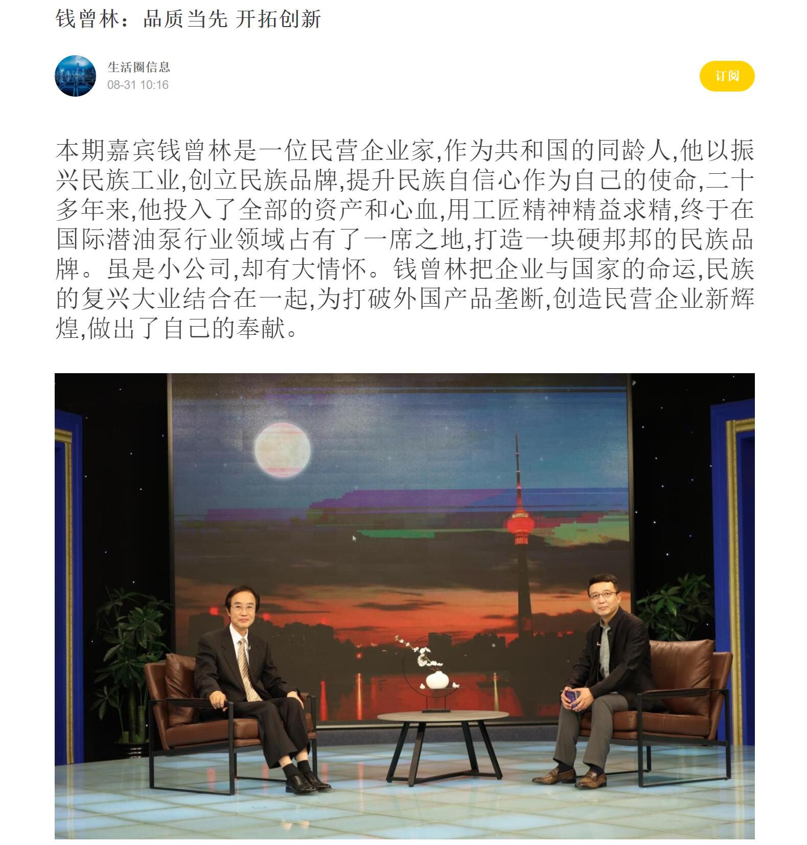 本期嘉賓錢曾林是一位民營企業(yè)家,作為共和國的同齡人,他以振興民族工業(yè),創(chuàng)立民族品牌,提升民族自信心作為自己的使命,二十多年來,他投入了全部的資產(chǎn)和心血,用工匠精神精益求精,終于在國際潛油泵行業(yè)領(lǐng)域占有了一席之地,打造一塊硬邦邦的民族品牌。雖是小公司,卻有大情懷。錢曾林把企業(yè)與國家的命運,民族的復(fù)興大業(yè)結(jié)合在一起,為打破外國產(chǎn)品壟斷,創(chuàng)造民營企業(yè)新輝煌,做出了自己的奉獻。